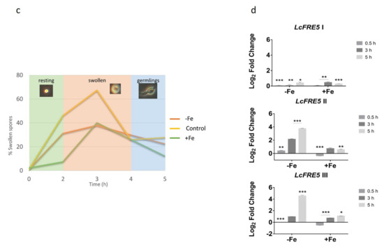 Deviation from norm-iron conditions appears to hamper spore swelling in L. corymbifera as shown for iron-limited and iron-stress conditions (Figure 1c). This prompted us to investigate the expression of the genes involved in the RIA pathway. Expression analysis of the putative LcFRE5 copies (I-III) indicate that all three copies show a moderate change in expression under iron-rich conditions but are differentially expressed in iron-limited environments (Figure 1d). Whilst LcFRE5-I does not appear to play any leading role under iron starvation while both LcFRE5-II and -III are strongly upregulated under iron-depleted conditions (Figure 1d).