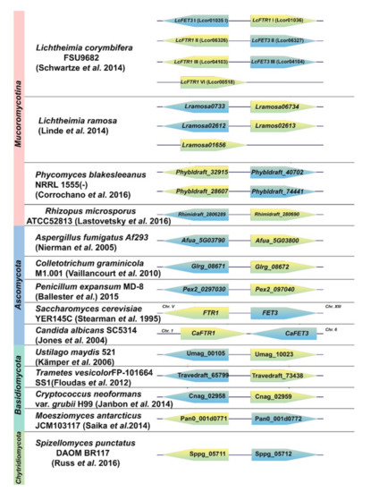 Synteny of Ftr1 (green) and Fet3 (blue) orthologue genes in different fungal division; all genes included were annotated as FTR1/FET3 or found to closely match known genes in BLAST analysis; labels represent the locus tag in the annotated genome; arrows indicate coding orientation; arrow length not representative of protein sizes, all data were obtained from the NCBI database [48,49,84,85,86,87,88,89,90,91,92,93].