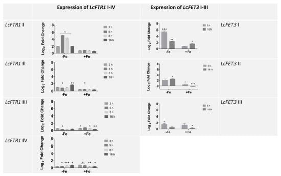 Expression profile represented as log2-fold change relative to the control condition of the putatively encoding L. corymbifera iron permeases (LcFTR1 I-IV) and the partner ferroxidase LcFET3 (LcFET3 I-II). Left panel: gene expression of the LcFTR1 I-IV under iron depleted, represented as −Fe (0.20 mM BPS) and iron stress simulated using (1.0 mM FeCl3. Expression represented as log2-fold change relative to each control condition. Right panel: gene expression of the LcFFET3 III for 5 h and 16 h under: iron depleted (0.20 mM BPS) and iron excess (1.0 mM FeCl3) conditions; data are means and standard error of three independent experiments. Asterisks indicates statistical significance determined by Student’s t-tests comparing treatment and control conditions at each time point (* p < 0.05; ** p < 0.01; *** p < 0.001). Data are means and standard error of three independent experiments.