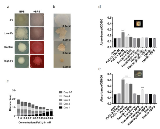 As L. corymbifera may possess a main Ftr1 permease that utilized during iron-depleted condition, spores were cultivated for seven days in the presence of increasing concentration of inorganic iron to determine the minimum inhibitory concentration of iron for L. corymbifera (Figure 4). At higher concentrations of iron, i.e., 3–4 mM FeCl3, a yeast-like morphology was observed with surrounding satellite colonies that lack the typical grey/white aerial hyphae as seen at 0.1 mM concentration of FeCl3 (or normal conditions) indicating tolerance of L. corymbifera to higher iron concentration (Figure 4a,b). However, fewer spores were harvested from 3 mM and 5 mM FeCl3 supplemented plates. Additionally, there were visible malformations in the sporangia and hyphae of the L. corymbifera grown at higher concentrations (3–5 mM). To quantify the hyphal growth, the colony diameter was measured daily for seven days (Figure 4c). The largest diameter was observed on plates that were not supplemented with FeCl3, thus indicating that iron storage of L. corymbifera is robust. Growth was slower at higher concentrations (1.0–4.0 mM) indicating adverse effect of iron excess on the growth of L. corymbifera. Significant drops in growth were observed between the concentrations of 3 and 5 mM FeCl3 (Figure 4c). Assimilation of different iron sources was done to determine the best growth-promoting iron source (Figure 4d,e). Whereas iron-excess given by 1 mM FeCl3 seems to inhibit spore germination at swollen spore condition as indicated by higher turbidity at OD600, ferritin and hemoglobin appeared to benefit filamentous growth during germling condition (Figure 4d). This indicates that L. corymbifera may be able to utilize these host iron sources. Interestingly, ferritin coupled with BPS cultures grew similarly to ferritin only suggesting that the L. corymbifera is equip at scavenging iron under stress.