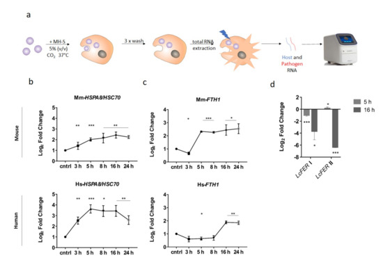 Expression profile of host protein Hspa8 (HSPA8), iron storage (FTH1) in macrophages and L. corymbifera during interaction for 24 h. (a) Schematic representation of workflow used for host pathogen interaction and gene expression validation. (b) Expression profile of the murine alveolar macrophage (MH-S) protein Hspa8 (HSPA8) and human Hspa8 protein (HSPA8) during interaction with L. corymbifera spores. (c) Expression pattern for host iron storage genes (FTH1) in murine alveolar macrophages (MH-S) and human macrophages. (d) Changes in gene expression for the putative copies for iron storage Ferritin (FER I and FER II) of L. corymbifera. Data are means and standard error of three independent experiments. Asterisks indicates statistical significance determined by Student’s t-tests comparing treatment and control conditions at each time point (* p < 0.05; ** p < 0.01; *** p < 0.001).