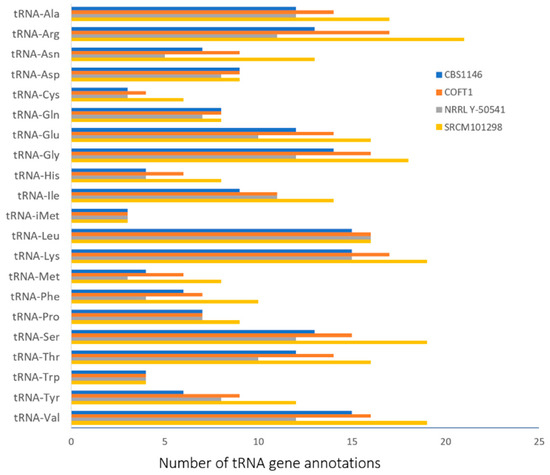 In addition, the total number of transfer RNA (tRNA) genes predicted by YGAP was compared between the strains (Table 1 and Figure 1). The results show a higher number of almost all types of tRNA in the genome of strain SRCM101298, which was not directly related to the total number of CDSs or with the genome size. These differences obtained in the annotation of tRNAs could explain the slight variation observed in the average nucleotide identity comparisons of Table 2. Nevertheless, the combined results of Table 1 and Table 2 show that the genomes of the three strains, excluding NRRL Y-50541, showed a high level of genome completeness, high level of similarity, and were annotated with high robustness with the present pipeline. Strain NRRL Y-50541 showed a smaller number of the annotated tRNA, which was expected due to the quality problems associated with this genome, as already discussed.