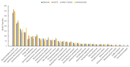 Furthermore, BLAST was used to identify proteins that revealed no homology with S. cerevisiae S288c, and, in this way, were labeled as unidentified. In detail, the unidentified proteins (between 464 and 503, as shown in the last column of Table 1) were used as a query against the NCBI RefSeq database, and BLAST results (top 5 hits for each protein) were clustered by considering the taxonomic groups with the top results. Figure 2 summarizes the obtained results, including only those species with more than 20 hits. Since these proteins were rare across the database, leading to various spurious results regarding organisms in the top 5 matches, all results were confirmed by using a reciprocal BLAST to test for the presence of T. delbrueckii in the matches when using these proteins as queries. Only those where a positive match was obtained were maintained in the analysis. These eliminated genes that were almost certainly not realistic matches but, instead, they were random matches when homologous genes were not detected in fungi (or at least not detected outside the main matches in Zygotorulaspora and Zygosaccharomyces), which, additionally, was supported by no matches detected in BLAST against a fungi database in the following analysis.
