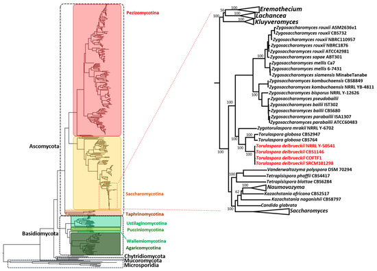 Phylogeny of fungi regarding 386 fungal core genomes (alignment of 204 common proteins). The phyla are highlighted using dashed lines and the subphyla are identified using colored boxes. The placements of the Torulaspora delbrueckii strains are shown in detail relative to the closely related species inside the Saccharomycotina subphylum. The concatenated alignment was used for the phylogenetic reconstruction by considering the maximum likelihood and 500 bootstrap replicates. The bootstrap values (in percentages) are shown for the highlighted branches. A detailed phylogenetic tree and the full bootstrap values are available in Supplementary Data S10.