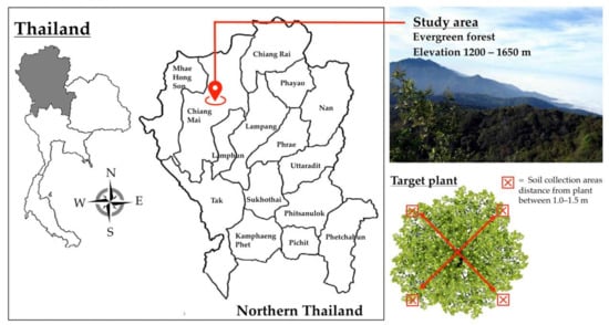This study was conducted in the native evergreen forests (elevation 1200–1650 m) of Doi Suthep Mountain, Mueang Chiang Mai, Chiang Mai Province, northern Thailand (Figure 1). The study site was located in nature reserves within Doi Suthep-Pui National Park. The dominant tree genera in the study site were Castanopsis, Quercus, and Pinus. Notably, B. alnoides (n = 36) and C. poilanei (n = 2) were found within the study site (Supplementary Table S1). Thus, this study focused on the soil samples of B. alnoides and C. poilanei as host plants of truffles in northern Thailand [,,]. Soil samples (n = 38) were collected from each host plant during the period of February to March, 2017 (the dry season and non-fruiting phase of the truffle) (Figure 1). Soil samples were randomly collected from four positions around target plants (Figure 1). After removing leaf litter, soil samples were aseptically collected at a depth of 5–10 cm from the surface of the soil and at a distance of 1.0–1.5 m from target plants using a soil core sampling tool (8.0 cm in diameter). Soil samples obtained from four positions of each target plant were pooled and kept in well-sealed sterile plastic bags. The samples were stored in an ice box and ultimately transported to the laboratory. All soil samples were air-dried at room temperature (27 ± 2 °C) immediately after reaching the laboratory. Each dried soil sample was ground using a mortar and pestle. The samples were then passed through a 250-µm sieve. All samples were stored at −80 °C until the process of eDNA extraction could be performed. Next, eDNA in the soil samples (each approximately 250 mg) was extracted using a NucleoSpin Soil DNA Isolation Kit (Macherey-Nagel, Germany) according to the manufacturers’ guidelines. All eDNA extracts were kept at −80 °C until further processing.