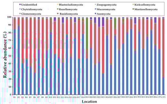 An investigation of soil mycobiota diversity in forest soil using fungal metabarcoding analysis has provided valuable information on the variety of distinct functional groups of fungi, including mycorrhizal, saprotrophic, and pathogenic fungi [,,,]. We have hypothesized that the soil mycobiota diversity of the host plants of truffles could be used to investigate truffle diversity and to assist in locating truffles during the non-fruiting phase. In this study, soil samples obtained during the non-fruiting phase from known truffle host plants (B. alnoides and C. poilanei) of northern Thailand were collected, while soil mycobiota diversity was investigated. Our results indicate that Ascomycota had the highest overall relative abundance at the phylum level in the soil samples followed by Basidiomycota, Mortierellomycota, and Mucoromycota. Similarly, Ascomycota was found to be the dominant phylum in the soil of evergreen and deciduous forests in northeast Thailand []. Moreover, these results were supported by the findings of previous studies, which reported that Ascomycota was associated with high levels of distribution and abundance in global soil samples [,,,,]. Our findings are similar to the findings of a number of previous studies [,,,,,,] that found that Inocybe, Lactarius, Meliniomyces, and Russula are ectomycorrhizal-dominated fungal communities in the soil samples of tropical, temperate and boreal forests. Moreover, Cortinarius, Piloderma, and Suillus were also found to be dominant, especially in boreal forests [,,]. In addition, Meliniomyces have been observed to be able to form both ectomycorrhiza and ericoidmycorrhiza [,]. Notably, certain previously published studies have reported that the geographical region, the specific season, the dominant tree species, nutrient availability, and the physical and chemical properties of the soil and soil depth all significantly affected the composition of the fungal community in the soil [,,,,].