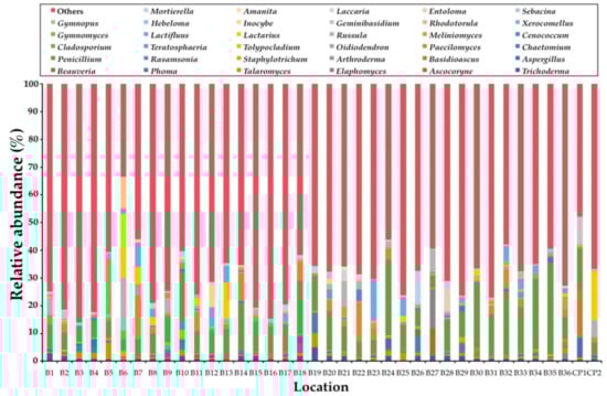 Soil fungal composition of each sample with the dominant of 35 fungal genera.