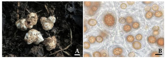 Ascocarps (A) and ascospores (B) of Tuber thailadicum collected from the representative locations of the truffle OTU (B14). Scale bar: A = 1 cm and B = 25 µm.