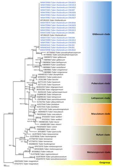 Truffle ascocarps were located following the results obtained from the eDNA data (Table 1) during the period from mid-May to September 2017. The results indicated that truffle ascocarps were found at 18 locations from a total of 30 locations, of which 16 locations were determined to be new truffle locations (Figure 4). However, truffle ascocarps were not found in the remaining 14 new locations. Truffle ascocarps were also not found in the absence of truffle OTUs locations. It was found that all 18 truffle ascocarps were obtained from the soil of B. alnoides. The morphological characteristics of 18 ascocarps that were collected from different locations are shown in Table 3. The results indicate that the morphological characteristics of ascocarps at each location were similar. Morphologically, all 18 ascocarps from each location were found to be quite similar to T. thailandicum. Ascocarps were 1.0−4.5 cm in diameter and white to light brown in color. Ascus contained one to four (rarely five) ascospores. Ascospores were globose to subglobose, sometimes broadly ellipsoid, 20–65 × 18–62 µm ornamented with a regular alveolate reticulum. Identification was confirmed by molecular phylogenetic analysis. The ITS sequence from ascocarps in B1, B2, B4, B5, B7, B10, B12, B13, B14, B15, B22, B26, B27, B29, B31, B32, B33, and B36 locations were deposited in GenBank under the numbers MW465642, MW465641, MW471002, MW471000, MW471001, MW470998, MW470999, MW470961, MW470960, MW470969, MW470965, MW470963, MW470962, MW470968, MW470964, MW470966, MW470967, and MW470970, respectively. For the phylogenetic analysis, sequences of 66 Tuber taxa were used, and T. magnatum was used as the outgroup. The alignment was deposited in TreeBASE under the study ID number 27568. A best scoring RAxML tree was established with a final ML optimization likelihood value of −8556.2711. The proportion of invariable sites and gamma distribution were 0.3890 and 0.5670, respectively. The average standard deviation of the split frequencies of the BI analysis is 0.00914.