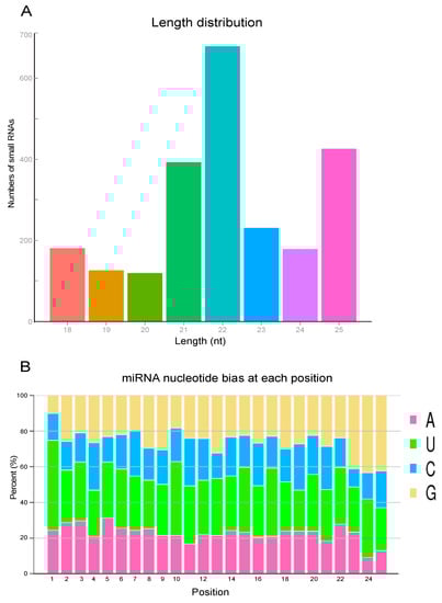 We noted that the peak of the total miRNA read length distribution occurred at 22 nt, representing the typical lengths of conserved miRNAs; and next most abundant lengths were 25 nt, corresponding to piRNA-like sequences (Figure 1A). Additionally, the examination of the first nucleotide bias of the miRNAs showed a strong preference for uracil “U” and adenine “A” (Figure 1B). The 5′ terminus of miRNA residues from 2 to 8 is believed to recognize the target mRNAs and repress posttranscription. The most abundant bases in such residues were U, U, U, A, U, U, and guanine “G”, respectively (Figure 1B).
