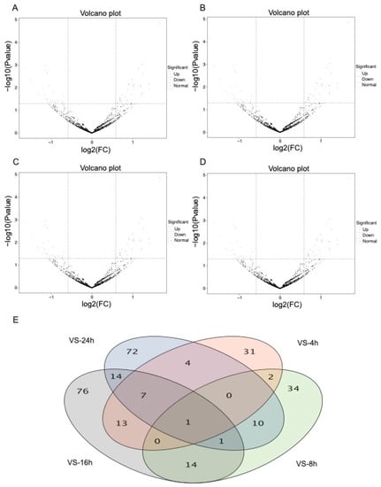 The volcano plot and numbers of differentially expressed miRNAs (DEmiRNAs) identified after M. anisopliae infection. (A) The volcano plot of DEmiRNAs at 4 h post-challenge; (B) the volcano plot of DEmiRNAs at 8 h post challenge; (C) the volcano plot of DEmiRNAs at 16 h post-challenge; (D) the volcano plot of DEmiRNAs at 24 h post-challenge; and (E) the Venn diagram of DEmiRNAs after M. anisopliae infection at 4, 8, 16, and 24 h.