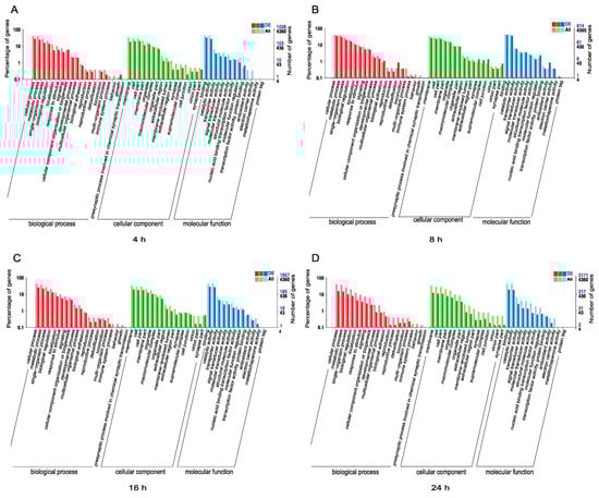 The GO categories of N. lugens DEmiRNAs identified during M. anisopliae infection. (A) The GO categories of N. lugens DEmiRNAs at 4 h post M. anisopliae infection; (B) the GO categories of N. lugens DEmiRNAs at 8 h post M. anisopliae infection; (C) the GO categories of N. lugens DEmiRNAs at 16 h post M. anisopliae infection, and (D) the GO categories of N. lugens DEmiRNAs at 24 h post M. anisopliae infection.