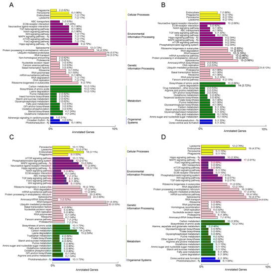 The enrichment and dispersion of differentially expressed miRNAs in KEGG pathways after M. anisopliae infection. (A) The identified pathways of DEmiRNAs after 4 h of M. anisopliae infection; (B) the identified pathways of DEmiRNAs after 8 h of M. anisopliae infection; (C) the identified pathways of DEmiRNAs after 16 h of M. anisopliae infection; and (D) the identified pathways of DEmiRNAs after 24 h of M. anisopliae infection. The asterisks indicate significant differences according to a p value < 0.05.