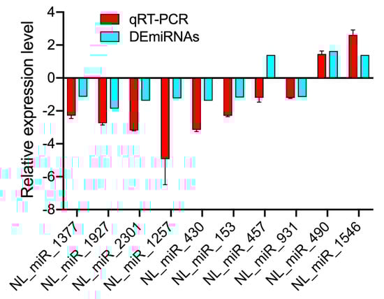 To further validate the DEmiRNAs identified through sequencing, we used RT-qPCR to analyze gene expression and confirm the results of RNA sequencing. We selected 10 of the highly expressed miRNAs based on the Illumina sequencing results. The results showed that the expression trends of the selected miRNAs showed a slight discrepancy from the findings of the sequencing analysis (Figure 5), which might be due to the differences in the sensitivity, specificity, and applied algorithms between the two techniques.