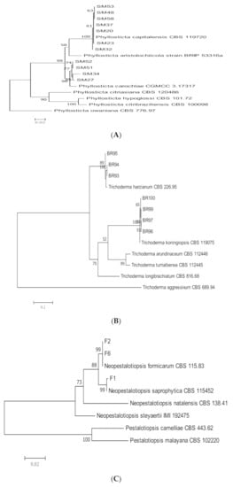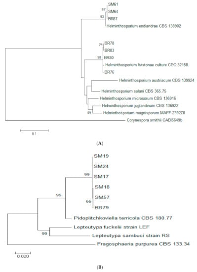 - Carbone, I.; Kohn, L.M. A method for designing primer sets for speciation studies infilamentous ascomycetes. Mycologia 1999, 91, 553–556. [Google Scholar] [CrossRef]