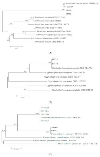 - White, T.; Bruns, T.; Lee, S.; Taylor, J. Amplification and direct sequencing of fungal ribosomal RNA genes for phylogenetics. In PCR Protocols: A Guide to Methods and Applications; Innis, M.A., Gelfand, D.H., Sninsky, J.J., White, T.J., Eds.; Academic Press: San Diego, CA, USA, 1990; pp. 315–322. [Google Scholar]