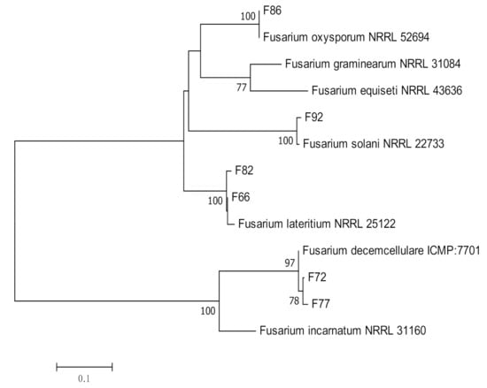 - O’Donnell, K.; Cigelnik, E. Two divergent intragenomic rDNA ITS2 types withina monophyletic lineage of the fungus Fusarium are nonorthologous. MoI. Phylogenet. Evol. 1997, 7, 103–116. [Google Scholar] [CrossRef]
