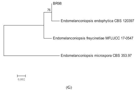 | Endomelanconiopsis endophytica BR98 | MN637809 | - | - | - | - | - | 99 |