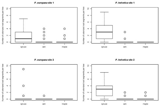 The number of colonized root segments per tree was investigated for the two most abundant CSPs, P. europaea and P. helvetica (Figure 1). Regarding both P. europaea and P. helvetica, spruce colonization was significantly higher than that of maple and ash, whereas maple and ash were in line with each other (Figure 1, Table 2, Table 3 and Table 4).