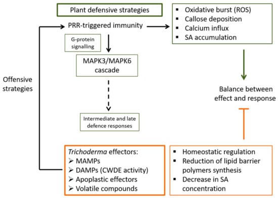 Schematic outline of plant’s early response to the interaction with Trichoderma. Plant´s cell surface pattern recognition receptors (PRR) are the first line of defence against Trichoderma effectors during the early response (this first stage of the colonization being considered by the plant as an attack). As a result of this first encounter between the plant and Trichoderma, a series of events will be triggered in the plant including the rapid release of reactive oxygen species (ROS), the deposition of callose, calcium influx, and accumulation of salicylic acid (SA) at the primary inoculation site as well as for systemic defence. Another one of the early events triggered by PRR stimulation is the activation of the mitogen-activated protein kinases (MAPK) cascade mediated by the G-protein complex, which will lead to several intermediate and late defence responses. Trichoderma spp. will find their way to balance this early plant response into one of mutual benefit by regulating homeostasis and reducing the synthesis of plant lipid barrier polymers, as well as by decreasing the production of SA.