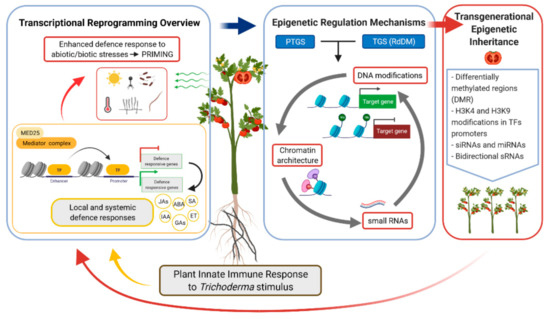 Schematic outline of plant immune local and systemic responses to Trichoderma priming stimulus. These responses involve a transcriptional reprogramming process where the action of enhancers (Mediator complex-subunit MED25) and transcription factors (TF) have a key role in the regulation of phytohormone synthesis pathways. Regulation of these processes is mediated by small RNAs (sRNA) through a transcriptional gene silencing (TGS) mechanism—mainly through the RNA-directed DNA methylation (RdDM) pathway—or through post-transcriptional gene silencing (PTGS), which has been proven to impact whole-genome DNA methylation patterns. The inheritance of these epigenetic marks on the offspring leads to the plant immune response against abiotic or biotic stresses without the need for an external stimulus triggered by Trichoderma. Abbreviations: SA, salicylic acid; JAs, jasmonates; ET, ethylene; ABA, abscisic acid; IAA, indole-3-acetic acid; GAs, gibberellins. Created in Biorender.com.