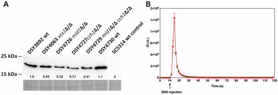 (A) Immuno-detection of aequorin in C. albicans by Western blot. Protein extracts were obtained as described in the Materials and Methods. Loading control images were obtained by Congo red staining of the nylon membrane after protein transfer. Pre-stained molecular weight standards are indicated at the left side. Designation of C. albicans isolates is indicated at the top. Aequorin signals (relative values) were quantified as described in the Materials and Methods using aequorin abundance signals of DSY3892 for reference and are indicated for each protein extract. Details of strain genotypes can be found in Table S1. wt: wild-type; wt control: untransformed wild-type. (B) Total luminescence emission of permeabilized C. albicans DSY3892 cells (Table S1). Cells were prepared as described in the Materials and Methods. SDS injection was performed after 10 s of pre-incubation in GLAC medium (arrow). Results were obtained from duplicate experiments and data were subtracted from the background in cells devoid of aequorin expression (CAF2-1). RLU: relative luminescence unit.