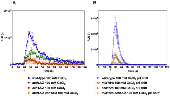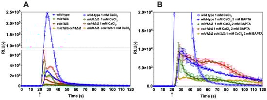 Mutants lacking the CCH1 and MID1 channels were tested in the same alkaline-induced conditions. The data showed that single cch1∆/∆ and mid1∆/∆ mutants exhibited significantly reduced Ca2+ accumulation as compared to wild-type, while the combination of both CCH1 and MID1 deletion resulted in a further reduction in Ca2+ accumulation (Figure 2B). The same trend was observed when only Ca2+ stress (100 mM) was added; however, luminescence signals were also much reduced as compared to alkaline stress conditions (Figure 2A,B). Taken together, these data are consistent with the idea that alkaline stress can trigger a rapid Ca2+ accumulation in C. albicans, as previously published []. These data are also consistent with the requirement for the Cch1/Mid1 channel complex to mediate calcium entry into the cell cytoplasm in C. albicans [,]. Our data also suggest that additional Ca2+ uptake should be present in C. albicans because the absence of the Cch1/Mid1 channel complex could not completely abolish the activity of the aequorin reporter system (Figure 2B). One likely additional candidate in this process could be Factor Induced Gene 1 (Fig1), a component of the low-affinity calcium-uptake system (LACS), which is activated under specific conditions in C. albicans [].