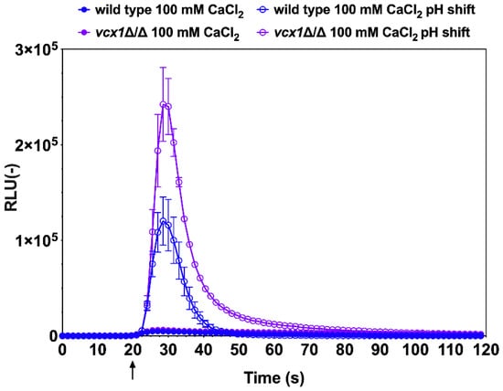 Relevance of the H+/Ca2+ exchanger, Vcx1, in Ca2+ homeostasis in C. albicans. Wild-type cells (DSY3892 and DSY4063) and the vcx1∆/∆ mutant were prepared as described in the Materials and Methods. Injections of 0.25 M Tris-HCl (pH 7.5) and CaCl2 (1 M) were performed after 20 s of pre-incubation in GLAC medium (arrow). Results were obtained from duplicate experiments and data were subtracted from background cells devoid of aequorin expression (CAF2-1). Comparisons of RLU values between the CaCl2-treated wild-type and vcx1∆/∆ mutants were not significant all time points, although they were significant (p < 0.001) in alkaline conditions after injections and up to 80 s of experiment time had elapsed.
