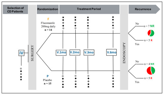 - Lille University Hospital; France Ministry of Health. Effect of Fluconazole on the Levels of Anti-Saccharomyces cerevisiae Antibodies (ASCA) After Surgical Resection for Crohn’s Disease. Multicenter, Randomized, and Controlled in Two Parallel Groups Versus Placebo; ClinicalTrialsgov ID: NCT02997059; France Ministry of Health: Paris, France, 2015.