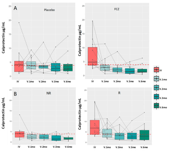 | Calprotectin | iV | 4.2 (3.3–8.7) | 0.002 |