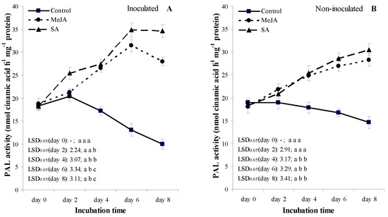 In the non-inoculated treatments, temporal patterns of PAL activity in fruits showed a continuous increase in MeJA and SA treatments, while a decrease was found in the water-treated control fruits (Figure 4B). PAL activity in fruits was non-significant between the MeJA and SA treatments at all assessment days, but the PAL activity in fruit was higher in both treatments at p = 0.05 compared to the water-treated fruits at the assessment period between days 4 and 8.