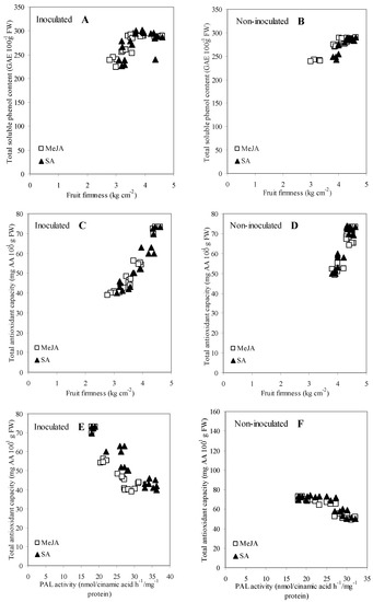 In order to determine the pair-wise relationship among the seven fruit measurements (FF, LC, TSPC, TAC, PAL, POD and SOD), Pearson’s correlation coefficients were quantified for the relationships among the seven fruit measurements in all combinations. Correlation coefficients and their corresponding significance levels (at p = 0.05 probability level) were determined separately for the inoculation–chemical treatment combinations (inoculation vs. MeJA, inoculation vs. SA, non-inoculation vs. MeJA, and non-inoculation vs. SA). Genstat 5 Release 4.1 (Lawes Agricultural Trust, Rothamsted, UK) was used for the analyses. Then, the best-correlated pair-wise variables were further analyzed. The strongest pair-wise relationships among the seven fruit measurements were further analyzed by linear regression analyses (f(x) = ax + b). Then, a t-test was used for comparing regression slopes in order to express the differences between MeJA and SA treatments separately for inoculated and non-inoculated fruits at p = 0.05.