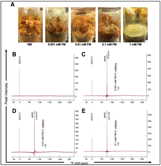 (A) Fruiting bodies of C. militaris cultured in normal and fluoride-supplemented media are shown. 19F NMR spectra of fruiting bodies raised in NM-C. militaris (B), 0.001 mM FM C. militaris (C), 0.01 mM FM C. militaris (D), and 0.01 mM FM C. militaris (E).
