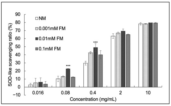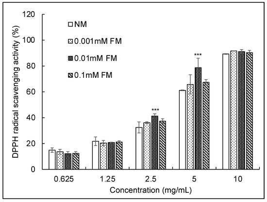 Figure 3 shows the DPPH radical scavenging activities of the four samples. All samples showed a dose-dependent inhibition of DPPH radical activity. The scavenging ratios of samples at 10 mg/mL of DPPH radicals were 89.32, 91.66, 91.20, and 90.30 for NM, 0.001 mM FM, 0.01 mM FM, and 0.1 mM FM C. militaris, respectively. Notably, 0.01 mM FM C. militaris exhibited the strongest DPPH radical scavenging activity from 2.5 to 5 mg/mL. The IC50 value (Table 3) of DPPH for NM C. militaris (4.16 mg/mL) was consistent with an earlier report on C. militaris (4.62 mg/mL) [50]. The IC50 values for 0.001 mM, 0.01 mM, and 0.1 mM FM C. militaris were 2.92 mg/mL, 2.59 mg/mL, and 2.89 mg/mL, respectively, and 0.01 mM FM C. militaris exhibited conspicuous free radical scavenging ability. This finding, combined with the results for SOD-like scavenging activity, suggests that the antioxidant ability of C. militaris was significantly improved by FM.