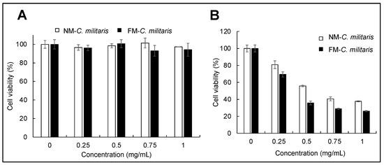TIG-3 and U2OS cells were seeded in 96-well plates at a density of 5000 cells/well and incubated at 37 °C and 5% CO2. After 24 h of incubation, the cells were cultured in varying concentrations of extracts prepared from C. militaris maintained in either NM or FM for 24 h. Cell viability was measured by the MTT (3-(4,5-dimethylthiazol-2-yl)-2,5-diphenyltetrazolium bromide; a tetrazolium dye) assay. MTT was then added into each well, and the samples were incubated at 37 °C for 4 h. The medium in each well was replaced with 100 µL of dimethyl sulfoxide to dissolve the insoluble purple formazan generated from yellow MTT by living cells. The optical density (OD) of the wells was measured at 570 nm using a microplate reader (Infinite M200 PRO, TECAN, Männedorf, Switzerland).