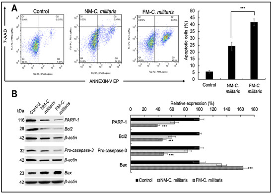 Apoptosis assay of U2OS cells treated with NM and FM C. militaris for 24 h. (A) Apoptosis analysis from flow cytometry. Quantitation of the results is shown on the right (mean ± SD, n = 3), *** p < 0.001 (Student’s t-test vs. NM C. militaris). (B) Western blot analysis for apoptotic proteins (PARP-1, pro-caspase 3, Bcl-2, and Bax) after 24 h. Quantitation of the results is shown on the right (mean ± SD, n = 3), *** p < 0.001 (Student’s t-test vs. control).