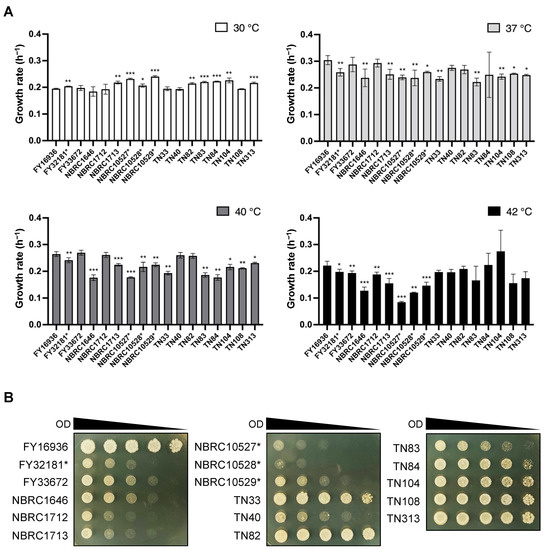 In the genus Schizosaccharomyces, S. japonicus is the only species that can grow at high temperatures (e.g., 40 °C) [13]. We, therefore, compared the growth rate of the 17 S. japonicus wild strains under high-temperature conditions. Cells were incubated in YEL medium at 30, 37, 40, and 42 °C, and the OD600 was measured with a photo recorder. At 30 °C, S. japonicus var. versatilis strains grew slightly faster than S. japonicus var. japonicus strains (e.g., the growth rate of NBRC10529* vs FY16936 was 0.241 ± 0.004 h−1 vs 0.195 ± 0.002 h−1, respectively); by contrast, most S. japonicus var. versatilis strains showed slower growth at 42 °C (Figure 1A). Almost all strains of S. japonicus grew fastest at 37 °C, consistent with findings from a previous study [6].