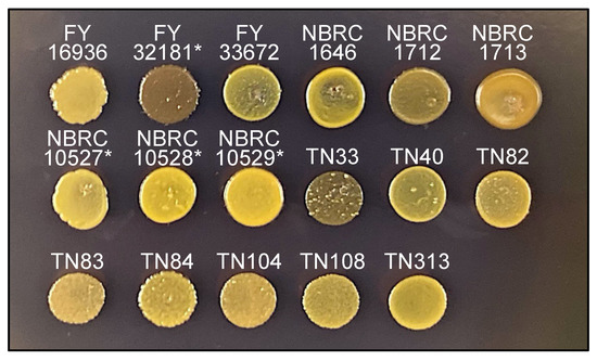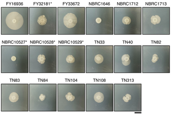 Differences in hyphal formation. Hyphal growth of 17 S. japonicus strains incubated on YMoA medium at 30 °C for 10 days. Two strains, NBRC1646 and NBRC10527*, did not form hypha under these conditions. S. japonicus var. versatilis strains were marked with an asterisk (*). Scale bar, 1 cm.