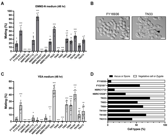 Mating response on different media. Mating frequency of 17 S. japonicus strains incubated on EMM2−N (A) or YEA (C) medium at 30 °C for 48 hours. At least 400 cells were examined for each strain. Data are the mean ± SD of nine samples. (B) Micrographs showing FY16936 (wild strain) and TN33 (a strain isolated from flies) incubated on YEA medium at 30 °C for 1 day. Scale bar, 10 µm. (D) Cell type proportion of some strains. Black bars indicate ascus or spore; white bars indicate vegetative cell or zygote. t-test: * p < 0.05; ** p < 0.01; *** p < 0.001.