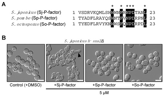 P-factor peptides were chemically synthesized (Eurofins Genomics, Tokyo, Japan) [29]. The purity of the preparations was confirmed to be more than 95% by HPLC. Each P-factor was dissolved in dimethyl sulfoxide (DMSO) at a concentration of 500 µM. For the assay, a heterothallic haploid S. japonicus strain lacking the endogenous sxa2+ gene was used. The cells were grown in YE medium overnight, washed with sterilized water three times, and then resuspended in EMM2−N medium at OD600 of 2.0. The cells were incubated with each P-factor peptide (5 µM) for exactly 24 hours with gentle shaking and then observed by DIC microscopy.