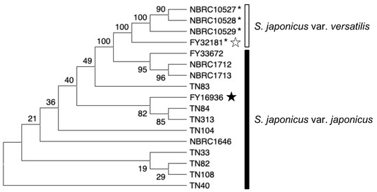 Evolutionary relationship of S. japonicus strains. Phylogenetic tree of the 17 S. japonicus wild strains investigated in this study. The analysis combined multiple sequence alignments for the map2, map3, and mam2 genes. The evolutionary history was inferred by using neighbor-joining [35] and the Kimura 2-parameter method [36], and the number of base substitutions per site is shown. All ambiguous positions were removed for each sequence pair. In total, there were 2766 positions in the final data set. Evolutionary analyses were conducted in MEGA X [37,38]. Black and white stars indicate the type strain of S. japonicus var. japonicus and S. japonicus var. versatilis, respectively. S. japonicus var. versatilis strains were marked with an asterisk (*).