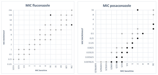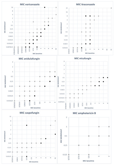 MIC values obtained with SY versus MIC values obtained with M-AM for each antifungal agent. The light colored dots represent MIC values within two dilutions between both methods. The dark colored dots represent MIC discrepancies of more than two dilutions.