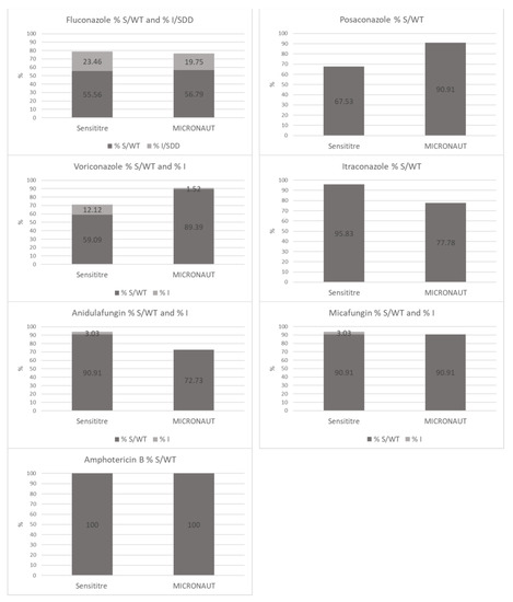 Susceptibility ratios. The percentage of S/WT and I/SDD Candida isolates for each antifungal agent, obtained with the M-AM system and the SY system was calculated and these results were presented visually. Chi-square test was performed to evaluate the differences to be statistically significant (p value of < 0.05).