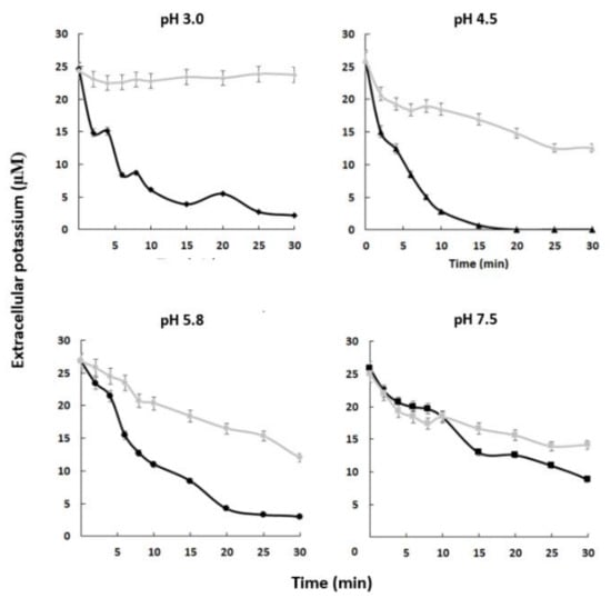 Absorption of external potassium in C. albicans HAK1+ and hak1− strains. K+-starved cells were resuspended (A600 0.5) in uptake buffer adjusted at the required pH (see the Materials and Methods) and containing 25–28 µM K+ approx. Samples of HAK1+ (black) and hak1− (gray) cells were taken at the indicated times, filtered, and K+ in the medium was measured. Mean values ± standard deviation obtained in three independent experiments are plotted.