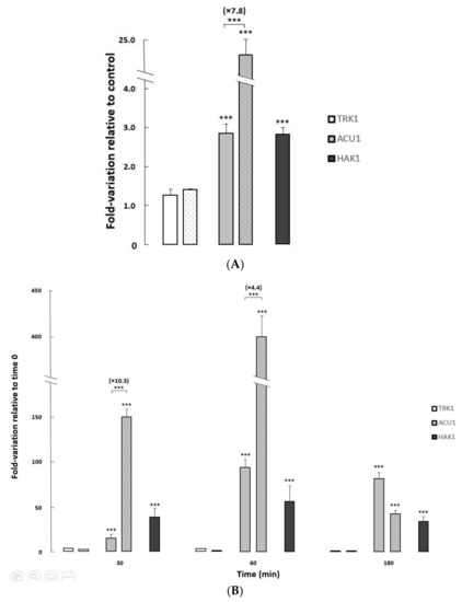 Changes in the pH of the media only provoked very slight variations on the transcription of TRK1, ACU1, and HAK1 genes in both strains studied (Elisa Rodríguez-Castro and José Ramos, Final Bachelor’s degree thesis, under progress). On the other hand, exposure to saline stress or potassium-limiting conditions triggered major changes in ACU1 and HAK1 transcription levels, particularly in the former where huge increments (>400-fold) could be observed upon potassium starvation (Figure 4).