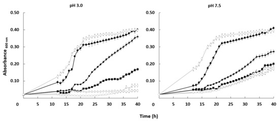 The growth curve of both strains was very similar in the absence of the toxic cation. When lithium chloride was added to the medium, the growth of both strains was affected but the mutant was more sensitive under some specific conditions. Differences between the HAK1+ strain and the one with the disrupted gene were more significant at pH 3.0. At acidic conditions, 0.15 M LiCl impaired growth of the mutant much more strongly than in the case of HAK1+ cells. At pH 7.5, the differences in tolerance between strains were much less important (Figure 5).