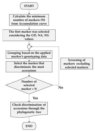 The minimum number of marker sets (n) needed to distinguish each accession was determined using the accumulation curve approach of the “poppr package” in R [34]. For minimum marker set combinations, initial markers were selected with high GD, NA, and NG values. From the second to the last marker, markers were sequentially selected based on their ability to subdivide the highest number of accessions according to the genotyping data. Grouping based on genotyping data was performed in Microsoft Excel. After selection of minimum marker set combinations, phylogenetic analysis was used to confirm whether the accession could be fully distinguished using the minimum marker (Figure 1).