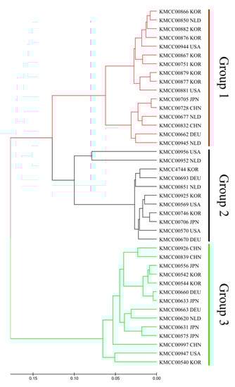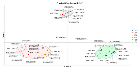 Multivariate and population structure analyses were performed to understand accession and population characteristics. Multivariate analysis included phylogenetic cluster analysis and principal coordinates analysis (PCoA), and population structure analysis was performed using a model-based structure. Phylogenetic tree analysis produced three groups: Group 1 (CHN 2, DEU 1, JPN 1, KOR 7, NLD 3, and USA 2), Group 2 (DEU 2, JPN 1, KOR 3, NLD 2, and USA 3), and Group 3 (CHN 3, DEU 2, JPN 4, KOR 3, NLD 1, and USA 1) (Figure 2). PCoA analysis also revealed three groups: P1 (CHN 2, DEU 1, JPN 1, KOR 7, NLD 3, and USA 2), P2 (DEU 2, JPN 1, KOR 3, NLD 1, and USA 2), and P3 (CHN 3, DEU 2, JPN 4, KOR 3, NLD 1, and USA 1) (Figure 3).