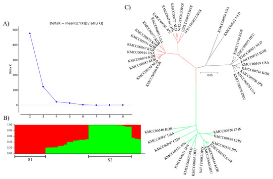 Model-based structure analysis produced two groups: POP 1 (CHN 2, DEU 1, JPN 1, KOR 7, NLD 3, and USA 2) and POP 2 (CHN 3, DEU 2, JPN 4, KOR 3, NLD 1, and USA 1), and the remaining accessions were classified as an Admix group. Population structure was revealed by classification of accessions into each group using an unrooted tree (Figure 4). Groupings were largely consistent across the three methods: Group 1, P3, and POP 1; and Group 3, P1, and POP 2 had the same accessions. Finally, Group 2 and Admix had the same accessions, with P2 having all except two of the same accessions.