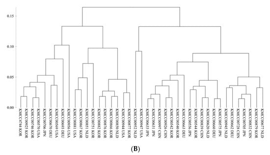 In previous studies, SNP markers showed a similar grouping pattern and more accurate lineage classification of the neighbor joining tree in population structure analysis compared to SSR markers [41,42]. In particular, the explanatory value for the first main coordinate in PCoA analysis was higher for SNP markers, and this was a common phenomenon regardless of accession [41,42]. No common characteristics were observed in the clustered accessions of all groups with the three clustering methods used in this study, and collection location did not correlate with accessions in the clusters. This may be because the SNP markers classified lineage, and the current commercial accessions were divided into relatively few lineages. In addition, accessions in geographically separated regions had similar sequences, consistent with the genetically similar nature of accessions cultivated worldwide [4].